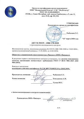В 2020 году пройден ежегодный инспекционный контроль, что подтверждается сертификатами: